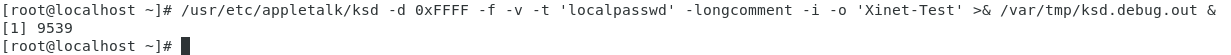 /var/adm/appletalk/services has the following listing for KSD:/usr/etc/appletalk/ksd -f -v -t 'localpasswd' -longcomment -i -o 'Xinet-Test', then run the below command (the changes are highlighted in bold):/usr/etc/appletalk/ksd -d 0xFFFF -f -v -t 'localpasswd' -longcomment -i -o 'Xinet-Test' >& /var/tmp/ksd.debug.out &